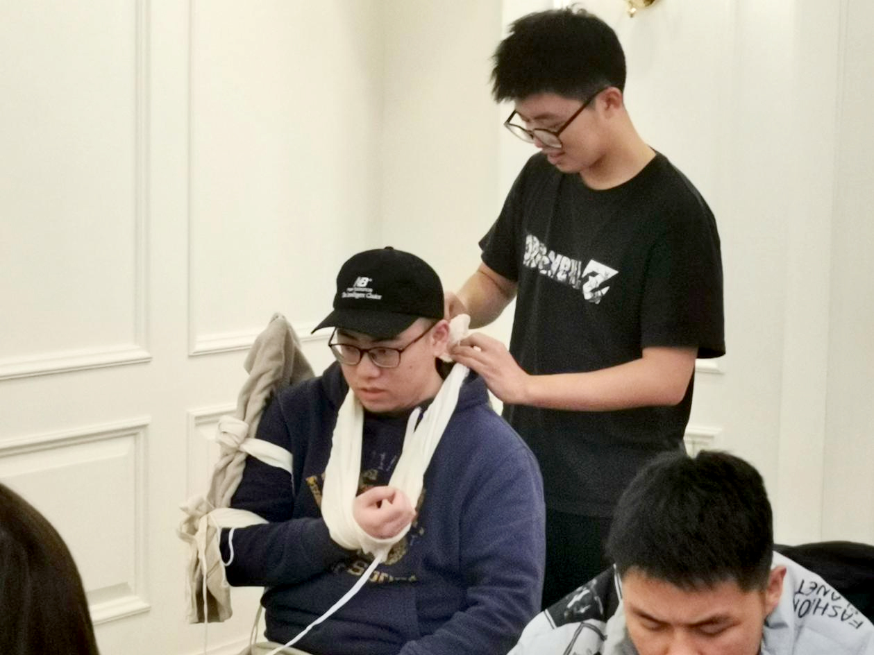 在为期两天的培训中,大家学习了心肺复苏、伤口止血包扎、骨折固定包扎、气道阻塞时急救及自救的方法。