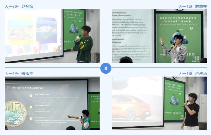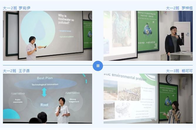 演讲比赛共吸引了9组选手参赛,他们分别来自不同班级。比赛中,选手们用流利的英语阐述了水污染、空气污染、光污染、土壤污染、放射性污染以及生物多样性缺失等环境问题。他们分别从政府、企业和个人三个维度提出了针对性解决方案。有的选手提出了通过政府加强立法监管,严厉打击非法排放污染物的企业;有的选手则呼吁企业积极采用清洁能源,推动绿色生产;还有的选手从个人角度出发,提出了减少塑料制品使用、倡导绿色出行等具体行动建议。