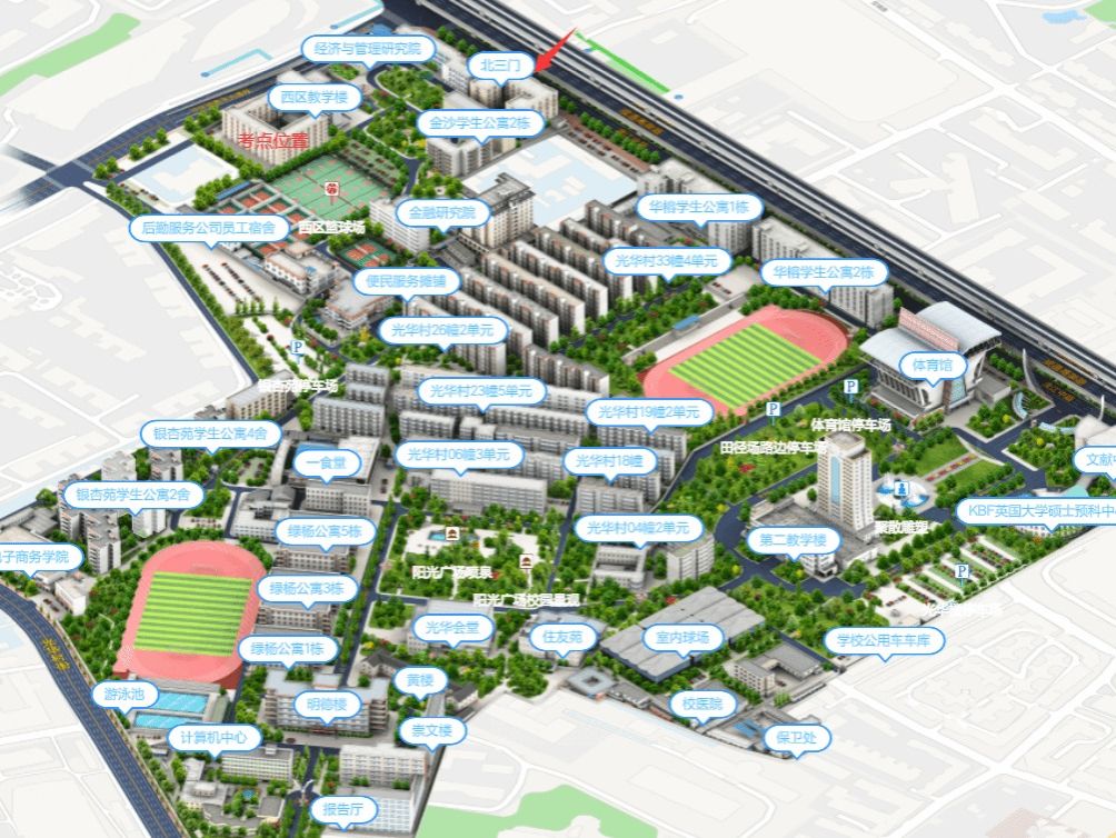 您的考试考点位于西南财经大学光华校区西区教学楼。光华校区北三门为考生出入指定校门,北三门位于成都市青羊区清江中路57号,地铁四号线文化宫站B出口前方约10米,金沙公交枢纽站对面。光华校区其它校门暂不允许考生进出。