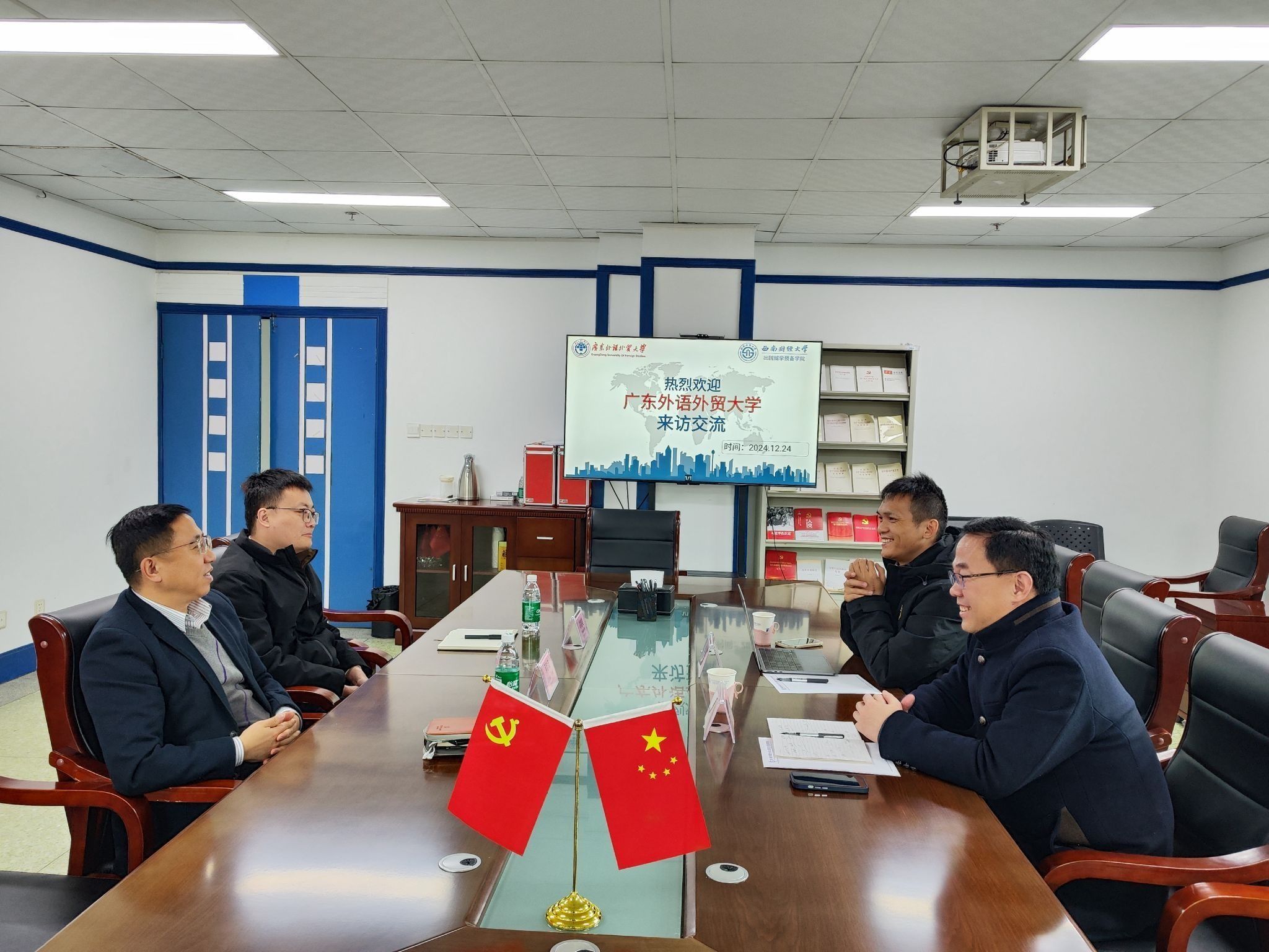 12月24日上午,广东外语外贸大学国际学院副院长迟殿堂、党政办主任张辉金来访澳门跑狗图 ,就共同拓展出国留学培训项目影响力推进教育国际化展开深入交流与探讨。澳门跑狗图 副院长邓忠波、招生办公室负责人许萌昊参加接待会谈。